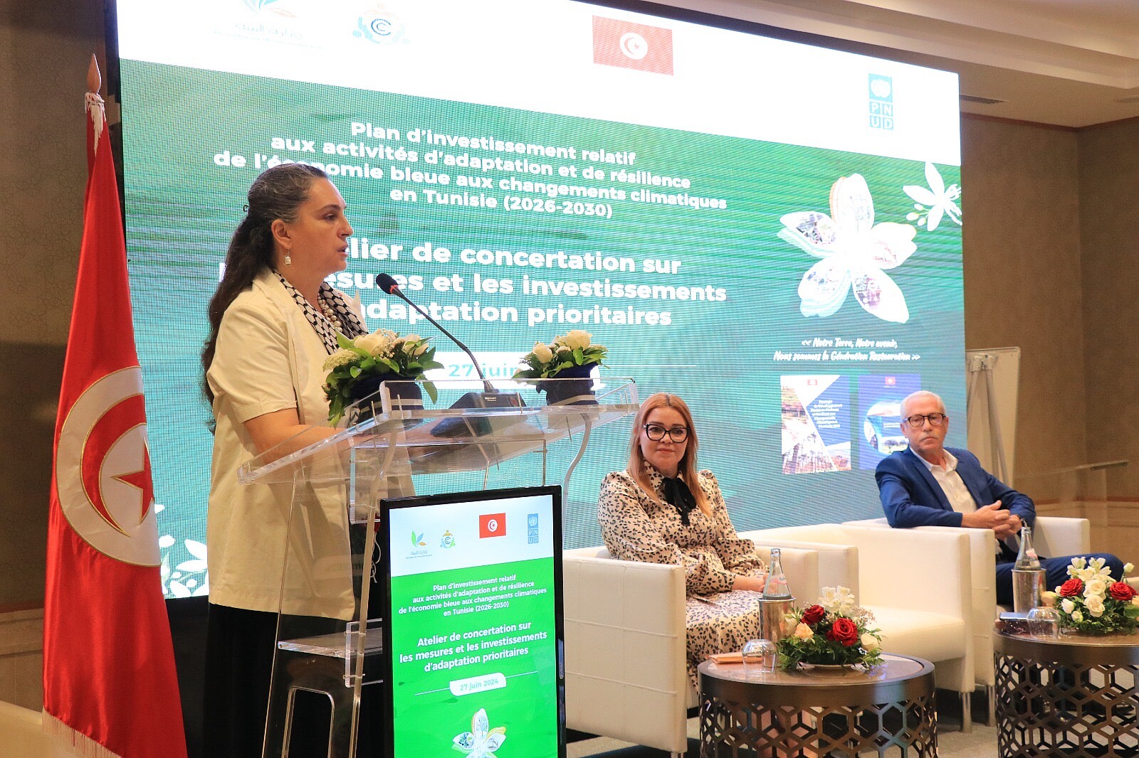 Dans le cadre des événements du mois de l’environnement de l’année 2024, le Ministère de l’environnement a organisé le 27 juin 2024 un atelier de concertation relatif aux mesures et investissements d’adaptation prioritaires dans le cadre du projet de « Plan d’investissement destiné à l’adaptation et à la résilience de l’économie bleue aux changements climatiques en Tunisie (2026-2030) », présidé par Madame la Ministre de l’environnement, qui accorde toute l’importance voulue à la préservation des 1300 kilomètres de côtes du pays, afin que la mer et le littoral puissent continuer à jouer le rôle crucial qui est le leur dans le développement économique et social des générations actuelles et futures.